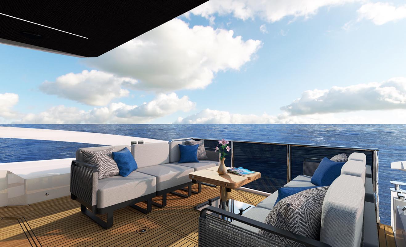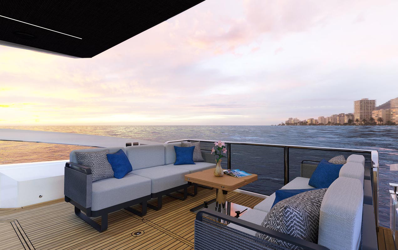 Широкая и уютная «террасная» кабина. Ее пространство можно менять в соответствии с образом жизни на борту, трансформируя модульную мебель. Боковые планширы открываются прямо на море, а застекленные балюстрады на корме обеспечивают отличный обзор из салона и поста управления. Кормовые диваны можно расположить в самых разных вариантах: для отдыха, беседы, принятия солнечных ванн. В носовой части – удобный СанДек, где любят загорать девушки.