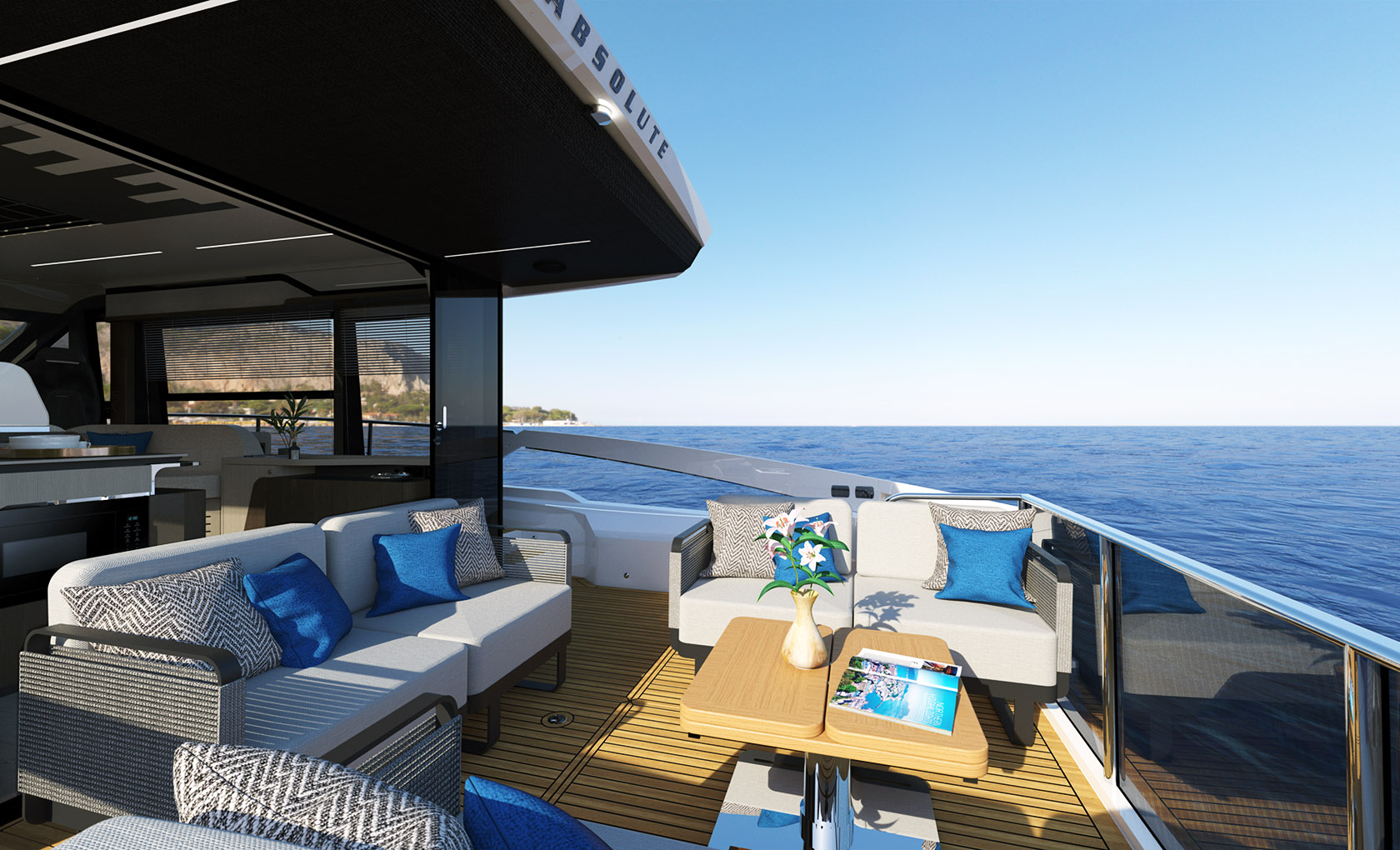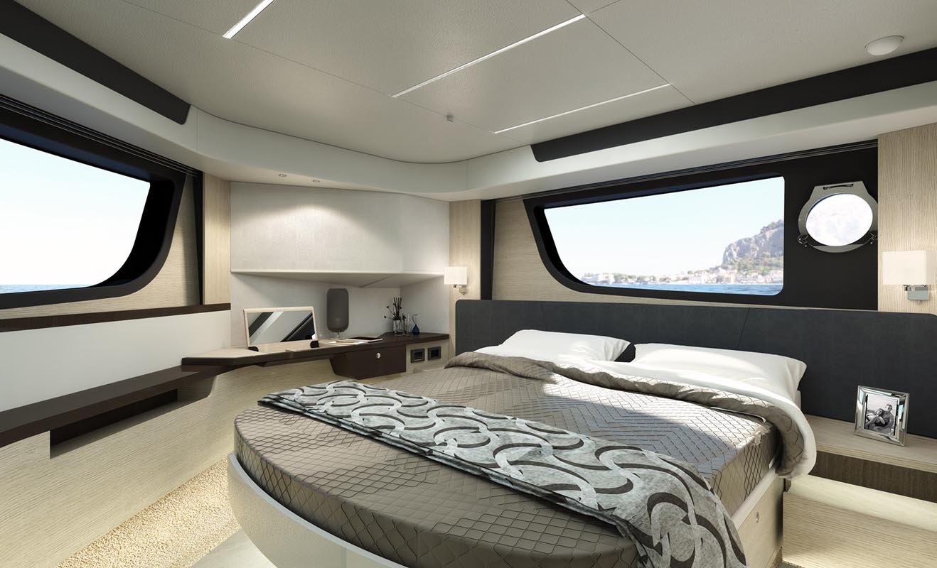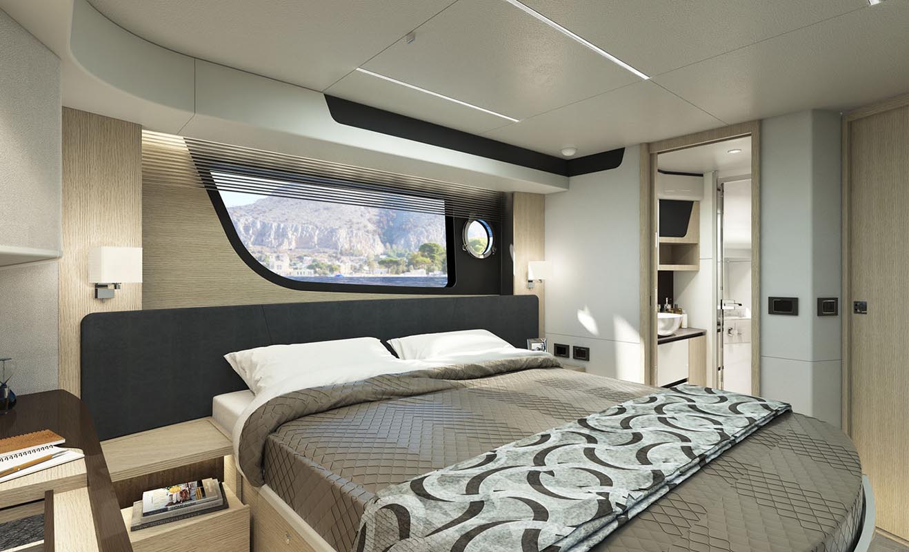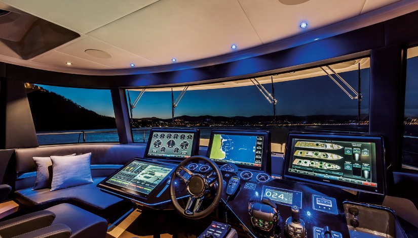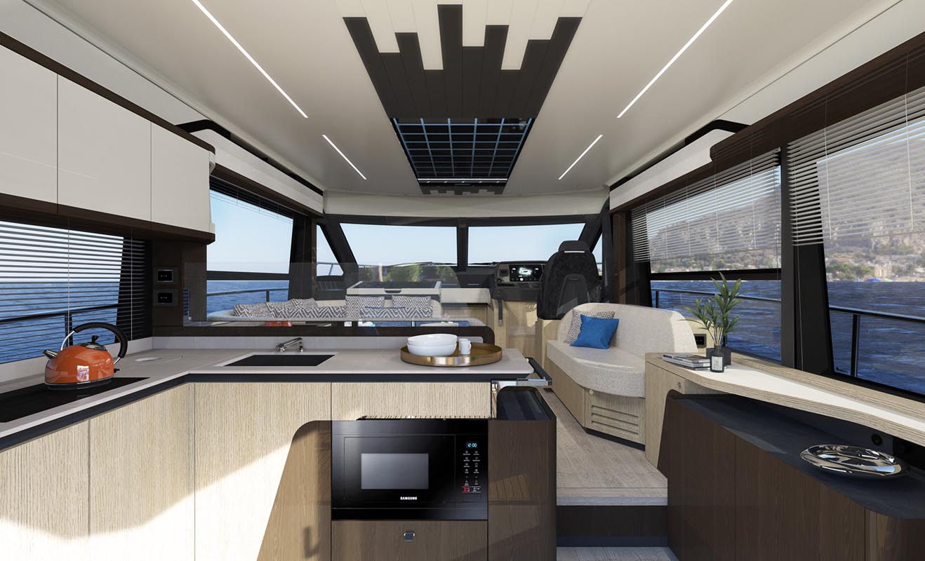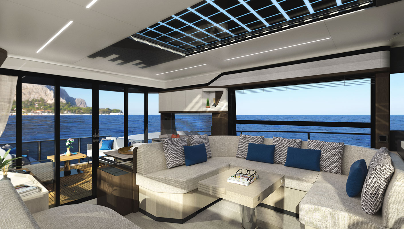 В салоне большие большие боковые окна охватывают всю палубу и вместе с панорамным лобовым стеклом обеспечивают отличный обзор. Изнутри этот захватывающий вид превращается в настоящую панораму на 360 градусов, это полное растворение в морской стихии. Окна гостиной открываются электроприводом, впуская морской бриз и создавая приятную естественную рециркуляцию воздуха.
